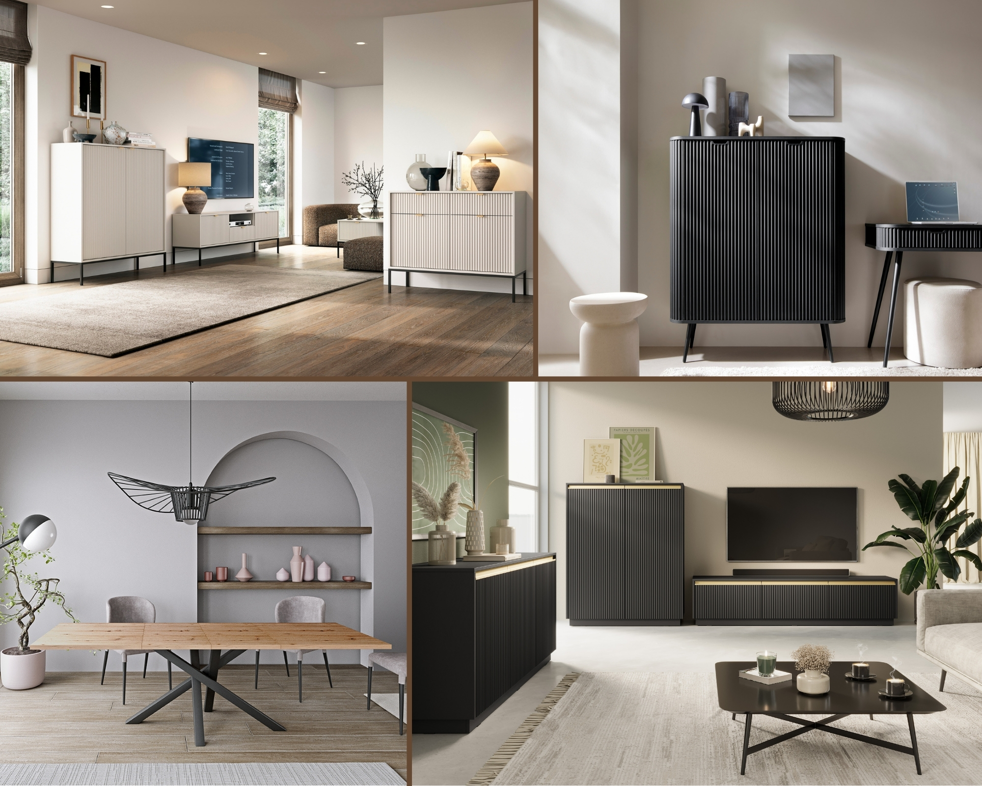 Nowoczesna komoda z lamelami wyposażona w 2 szafki i 4 szuflady kolekcja Camelo