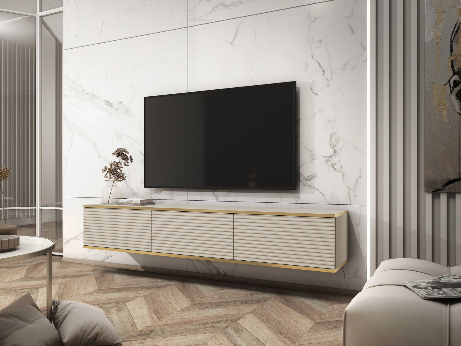 - Beżowa szafka RTV Vetro dostępna w 2 rozmiarch - 135cm (2 drzwiowa) i 175 cm (3 drzwiowa) z gładkim lub ryflowanym frontem, na nóżkach lub wisząca, złote wstawki
