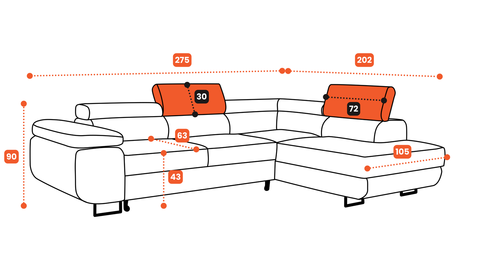 - Duży nowoczesny narożnik L-kształtny, funkcja spania, automat typu delfin, pojemnik na pościel, 5-stopniowa regulacja zagłówka, tkaniny do wyboru.