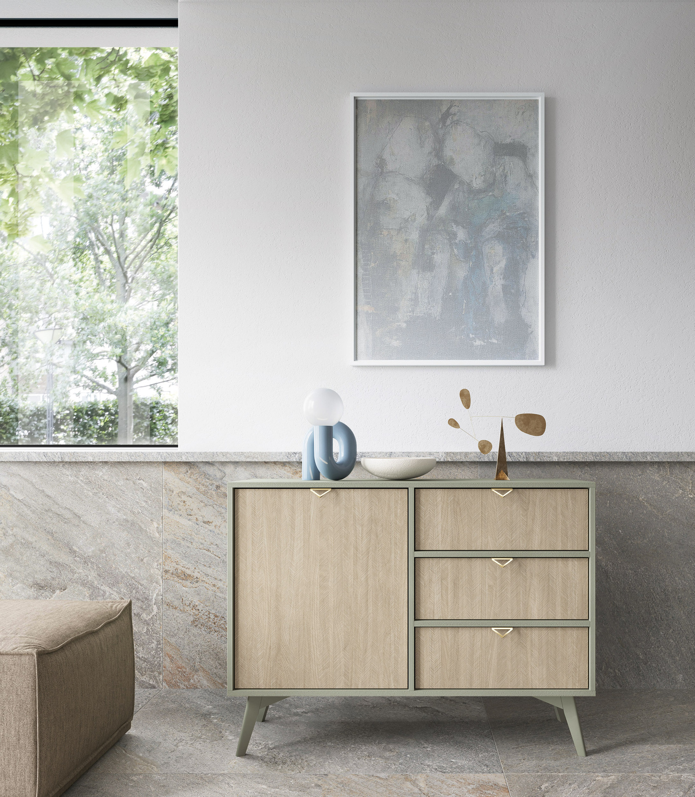 - Komoda w skandynawskim stylu, dostępna w 2 kolorach - Eukaliptus/Jodełka Skandi oraz Beż Piaskowy/Jodełka Skandi, wyposażona w 1 szafkę i 3 szuflady, malowane bukowe nóżki w kolorze korpusu, aluminiowe złote uchwyty, kolekcja Idaho