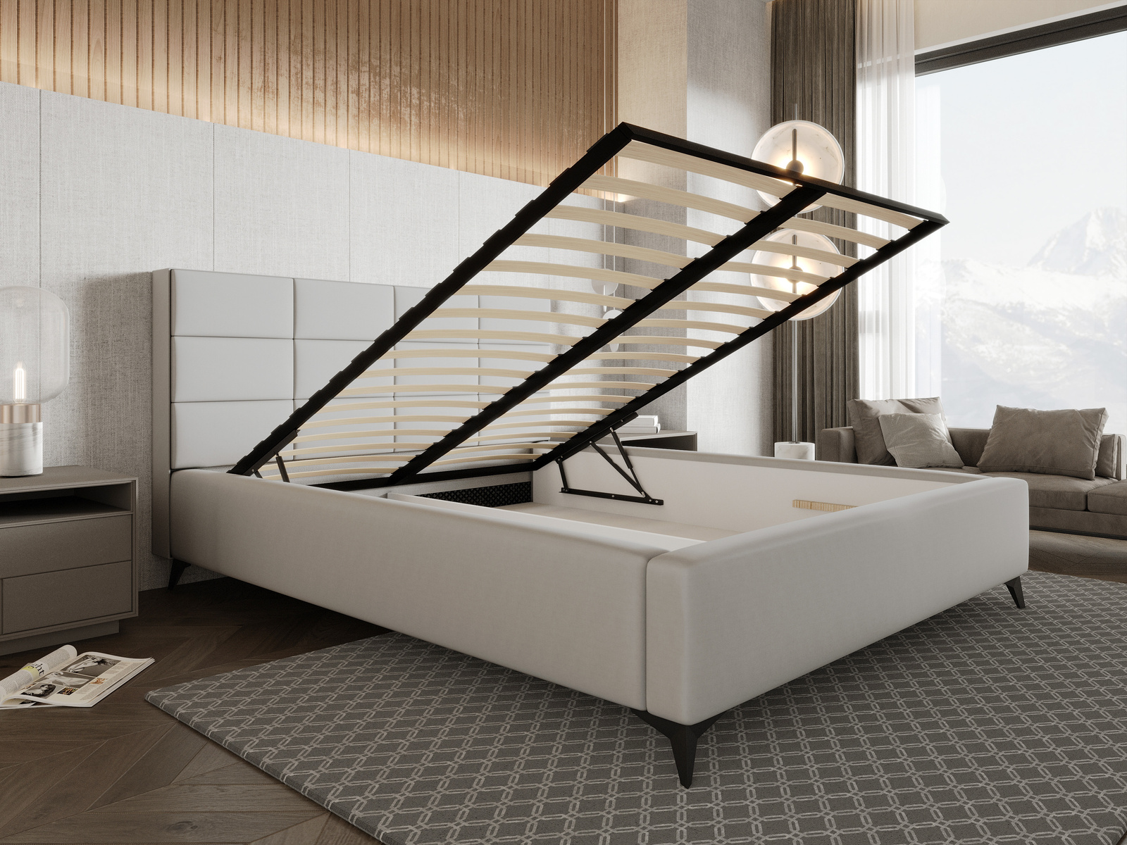 Pod stylową formą kryje się praktyczne rozwiązanie – przestronny pojemnik na pościel, który pozwala na wygodne przechowywanie kołder, poduszek czy sezonowych tekstyliów. Metalowy stelaż z gazowym podnośnikiem sprawia, że dostęp do schowka jest szybki i bezproblemowy. Stelaż posiada 34 elastyczne listwy sprężynujące (po 17 na stronę) wspierające materac, gwarantując stabilność i wygodę snu. Konstrukcja opiera się na stabilnych, metalowych nóżkach, które zapewniają trwałość oraz lekkość wizualną całej bryły.