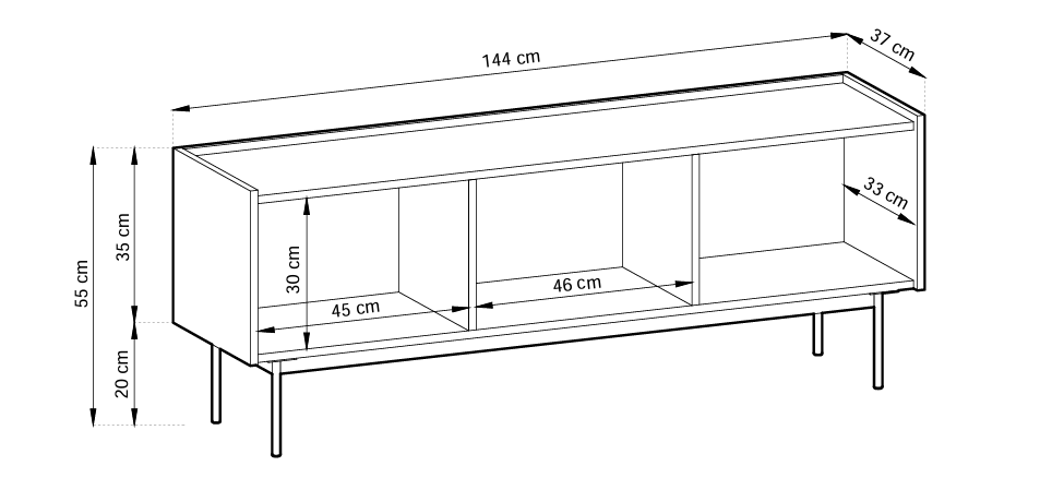 Szafka Bahia zachwyca minimalistycznym designem. Bezuchwytowe fronty nadają jej subtelnej elegancji, a pojemne półki oraz szafki ukryte za drzwiczkami oferują mnóstwo miejsca na sprzęt RTV, książki czy inne drobiazgi. Wsparta na smukłych, metalowych nóżkach o wysokości 20 cm, mebel prezentuje się lekko i nowocześnie, ułatwiając jednocześnie utrzymanie porządku pod nim.