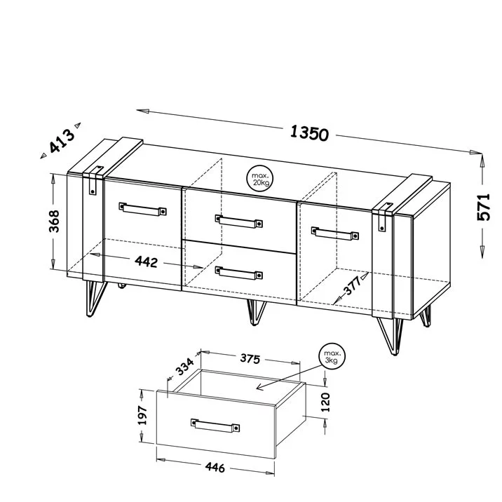 - Szafka rtv z dwoma drzwiami i dwoma szufladami.