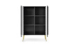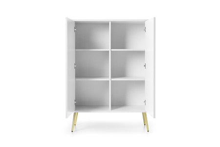 - Nowoczesna, wysoka, 2-drzwiowa komoda, wyposażona w 6 schowków, frezowane fronty, metalowe nóżki w czarnym lub złotym kolorze do wyboru, kolekcja Venice dostępna w 3 wybarwieniach: czarny, biały oraz cashmere